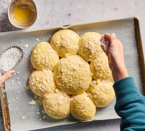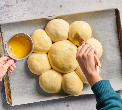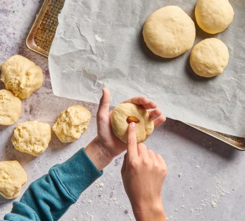 Divide the dough into 8 small portions and 1 large portion. Shape into balls, inserting the almond (king) into one of the small balls. Place the large ball in the centre of the prepared tin, arrange the small balls evenly around it, cover and leave to rise for approx. 30 mins.