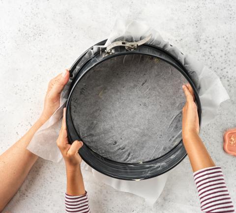 Line the base of the tin with baking paper, close the tin frame (approx. 26 cm diameter), grease the edges with a little butter.
