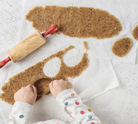 Roll out the dough in batches between two sheets of baking paper to approx. 4 mm thick. Cut out egg shapes (approx. 6 cm in diameter), place on two baking trays lined with baking paper.