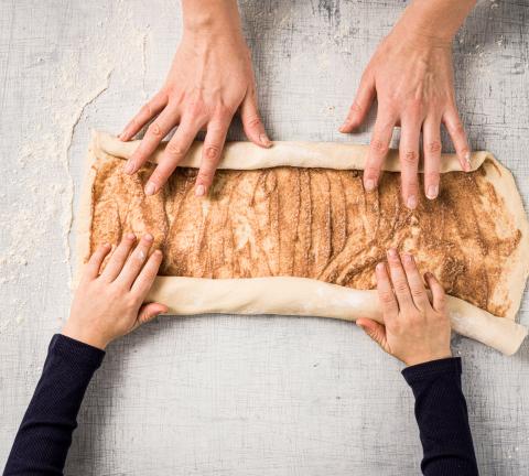 On a lightly floured surface, roll out the dough into a rectangle (approx. 30 x 40 cm). Spread the filling on top, leaving a border of approx. 1 cm all the way around. Roll the two long edges of the dough in towards the middle. Using a bread knife, gently cut the roll into slices approx. 3 cm thick, transfer to a baking tray lined with baking paper. Shape into hearts, pressing the tips of the dough together firmly. Cover and leave to rise at room temperature for a further 30 mins.