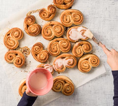 Mix the remainder of the chilled yoghurt with icing sugar to create a thick icing. Brush the cinnamon roll hearts with the icing, leave to cool on a rack.
