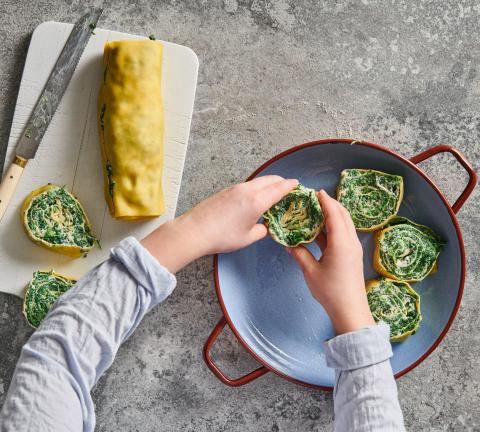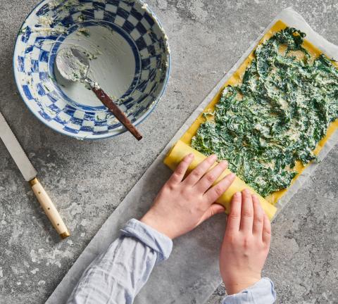 Roll out the pasta dough, spread the filling on top. Roll up the pasta dough, starting from the narrow end.