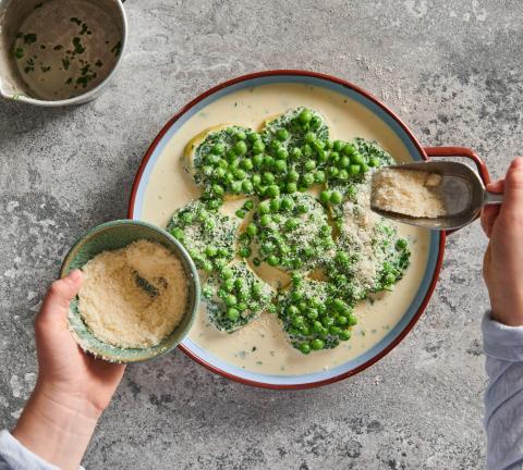 Bring the stock and single cream to the boil in a pan. Tear off the parsley leaves, chop finely. Add the peas and parsley to the stock, pour over the pasta rolls. Scatter the cheese on top.