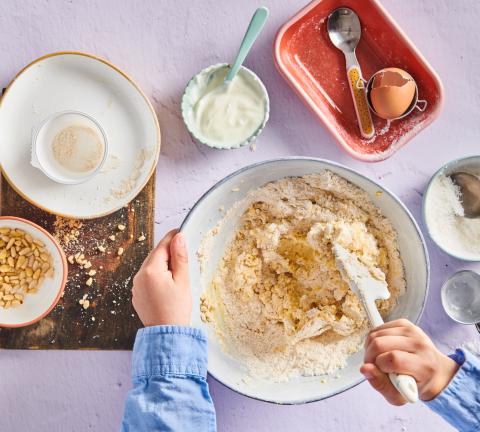 Place the icing sugar, butter and egg in a bowl, beat for approx. 3 mins. using the whisk on a mixer. Stir in 1 tbsp of yoghurt. Finely chop the pine nuts, mix with the flour, coconut flakes, baking powder and salt, mix into the butter mixture, combine to form a dough. Flatten the dough, cover and chill for approx. 30 mins.