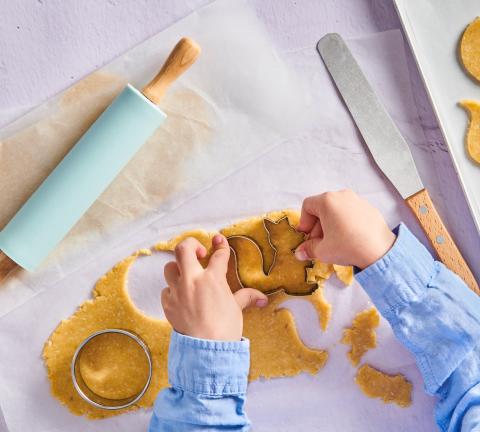 Roll out the dough in batches between two sheets of baking paper to approx. 4 mm thick. Cut out approx. 12 circles (approx. 6 cm in diameter) and approx. 12 squirrels, place on two baking trays lined with baking paper.