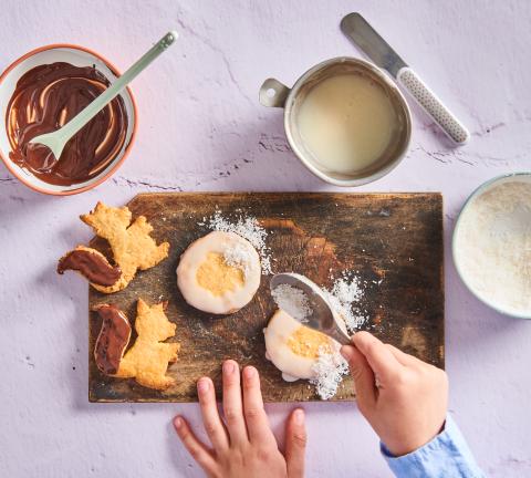 Pour the icing sugar into a small bowl, stir in approx. 2 tbsp of the reserved yoghurt to make a thick icing. Using a teaspoon, coat the edges of the biscuits with the icing, sprinkle with the coconut flakes. Use writing icing to draw on the eyes and mouth. Add a Smartie for the nose and pine nuts for the ears and teeth.