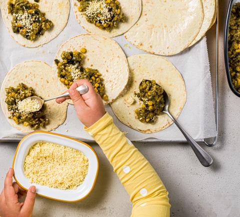 Place the tortillas on a baking tray lined with baking paper, brush both sides with oil. Spread the filling over the bottom half of the tortillas, sprinkle with cheese, fold the empty half over the top, press down gently.