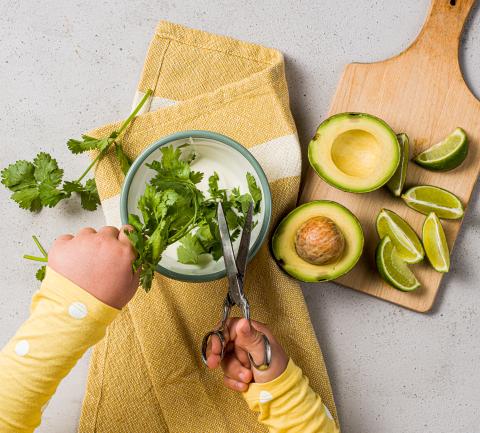 Tear the leaves off the coriander, chop finely with scissors, place in a small bowl. Stir in the yoghurt and oil, season. Halve the avocado, remove the stone, cut into pieces, cut the lime into wedges. Serve the tacos with the dressing, avocado and lime.