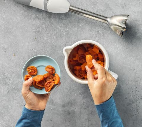 Halve the squash, remove the seeds, cut into pieces. Cook the squash in boiling salted water for approx. 20 mins. until soft, drain well. Place the squash in a measuring cup, allow to cool slightly. Add the apricots to the squash, puree until smooth, place in a bowl.