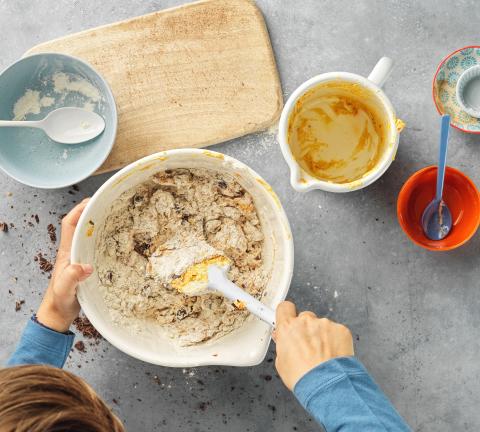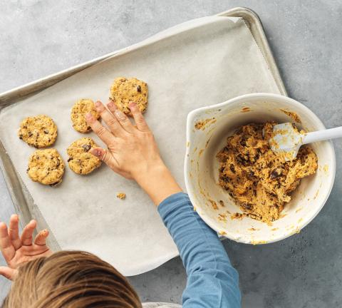 Using 1 tbsp of dough per cookie, shape into balls and place on two baking trays lined with baking paper, flatten slightly. Sprinkle with the oats.