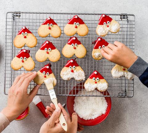 Mix the icing sugar, water and food dye to make a thick icing. Dip the tip of the hearts in the icing, place a sugar pearl on the tip of each biscuit. Stick on two sugar eyes.