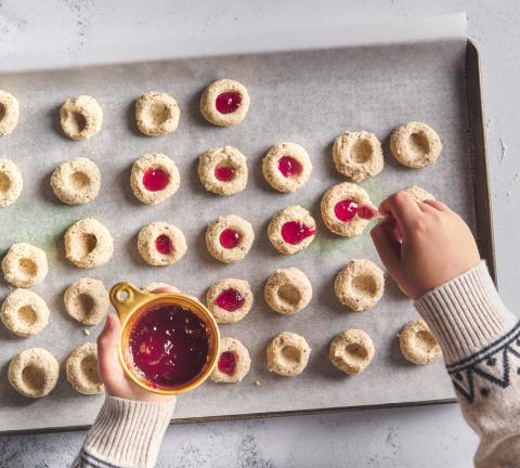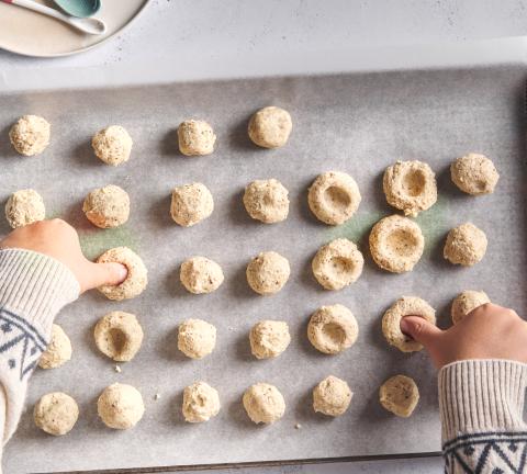 Divide the dough by hand into walnut-sized balls and place on two baking trays lined with baking paper. Use a finger to make small depressions in the middle of the biscuits.