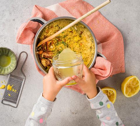 Empty the couscous into a bowl. Pour the stock into a pan, bring to the boil, pour over the couscous, cover and leave to absorb for approx. 10 mins. Grate in the lemon zest, squeeze out the juice, add with the oil. Separate the couscous with a fork.