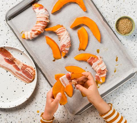Wrap each slice of squash in 2 rashers of bacon, place on a baking tray lined with baking paper, sprinkle with sesame seeds.