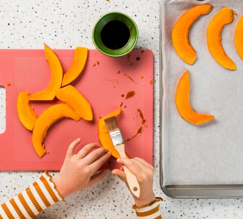 Combine the soya sauce and honey, use to coat the slices of squash.