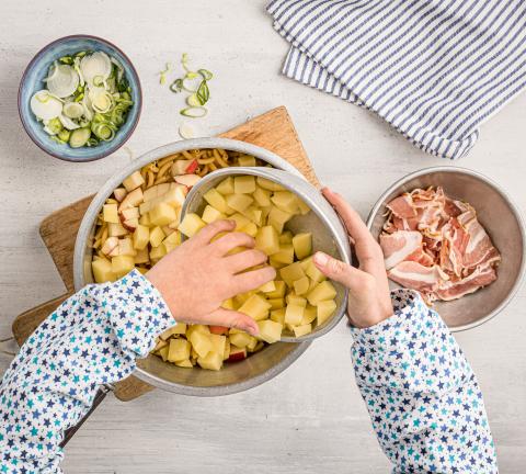 Eplucher les pommes de terre, les couper avec la pomme en morceaux de même taille (env. 1 cm). Couper l'oignon botte en rondelles fines et le lard en morceaux.