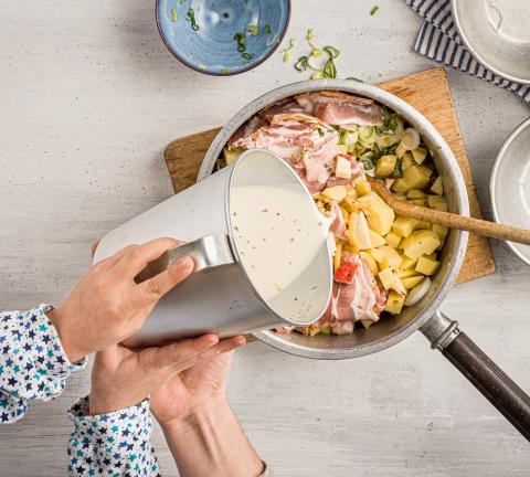 Mettre dans la casserole les pâtes, les dés de pomme, les rondelles d'oignon, les morceaux de pommes de terre et le lard, la crème et le bouillon, mélanger , porter à ébullition. Faire cuire à couvert pendant env. 8 min à feu moyen en remuant de temps en temps jusqu'à ce que les pâtes soient al dente.