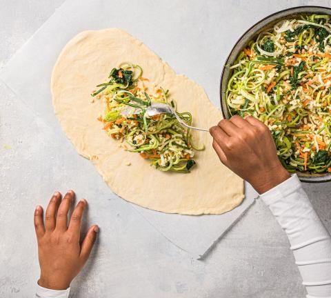 Couper le poireau en rondelles, bien presser les épinards. Eplucher les carottes, puis les râper à la râpe à röstis. Mélanger les légumes avec le fromage et la maïzena, assaisonner.