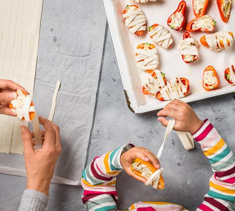 Faire cuire env. 30 min. dans le bas du four préchauffé à 200 °C. Sortir du four, laisser refroidir un peu. Garnir les poivrons tièdes de deux yeux en sucre, les laisser refroidir sur une grille.