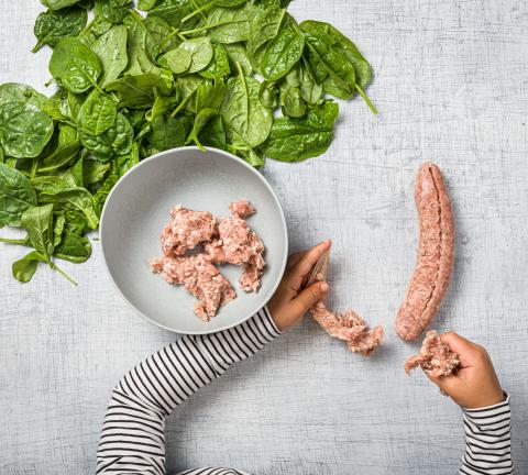 Inciser les saucisses dans la longueur, sortir la chair et l'effilocher. Hacher menu l'oignon, couper grossièrement les épinards.