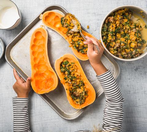 Faire chauffer l'huile dans une poêle, y faire revenir la chair à saucisse pendant env. 5 min., réserver. Faire suer l'oignon dans la même poêle. Ajouter la pulpe de courge et poursuivre la cuisson pendant env. 5 min. Ajouter les épinards, laisser réduire. Ajouter le bouillon et la crème fraîche, laisser mijoter env. 5 min., remettre la chair à saucisse, assaisonner. Répartir la farce dans les moitiés de courge, puis placer celles-ci sur une plaque recouverte de papier cuisson.