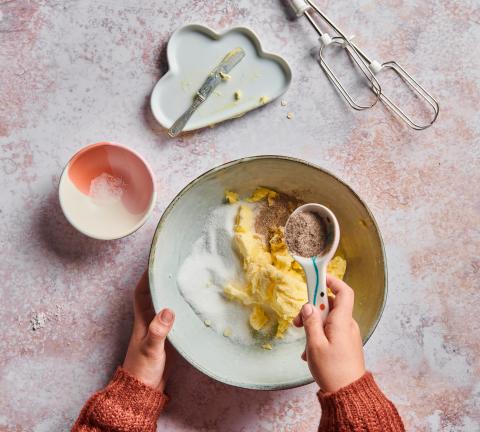 Mettre le beurre, le sucre et le sucre vanillé dans un récipient, bien mélanger au batteur électrique.
