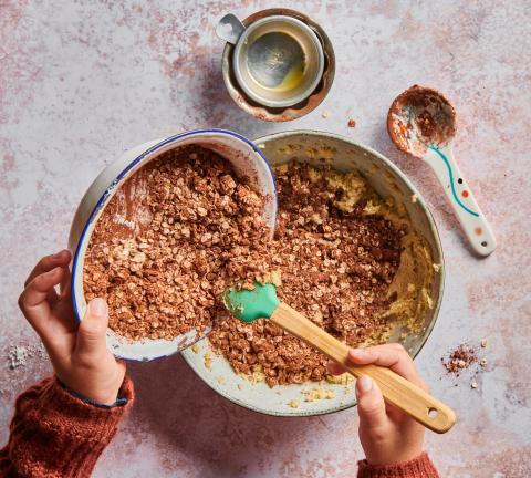 Mélanger les flocons d'avoine et le cacao, les ajouter à la masse au beurre ainsi que le jus d'orange, mélanger. Couvrir et mettre au frais env. 30 min.