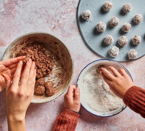 Mettre les flocons de noix de coco dans une assiette creuse. Former env. 30 boules de la taille d'une noix, les passer dans les flocons de noix de coco puis les poser sur une assiette. Mettre les boules au cacao au frais jusqu'au moment de servir.