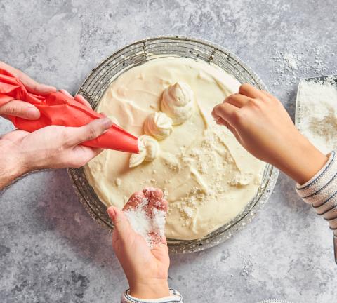 Monter la crème en chantilly, l'incorporer délicatement au chocolat. Mettre env. 50 g de cette crème dans une poche à douille cannelée (env. 10 mm de ∅). Mettre le tout au frais pendant env. 30 min.