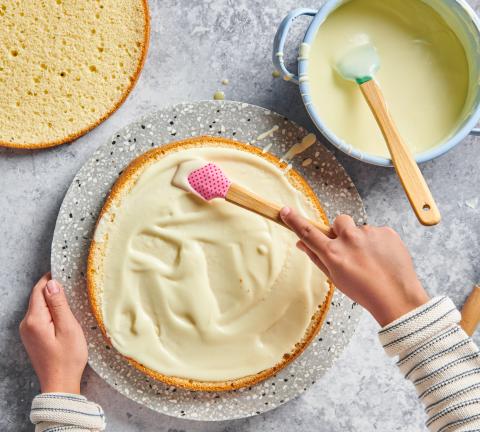 Garnir le fond de tourte de la moitié de la crème, recouvrir de la partie supérieure de la tourte. Répartir l'autre moitié de crème dessus et en badigeonner les bords. Mettre au frais pendant env. 30 min.