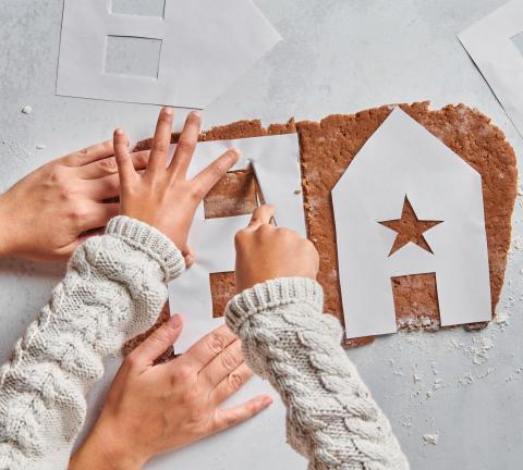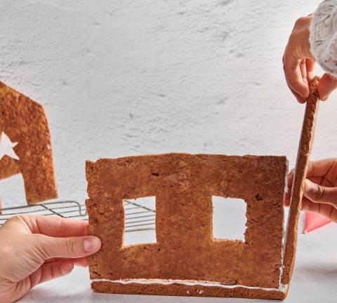 Pétrir la pâte une nouvelle fois. Fariner légèrement le plan de travail, y abaisser la pâte par portions sur env. 4 mm d'épaisseur. Poser les gabarits sur la pâte (plancher, 4 murs et deux parties du toit), les découper puis découper la porte et les fenêtres dans les murs. Découper des sapins à l'emporte-pièce dans le reste de pâte. Poser toutes les pièces sur deux plaques recouvertes de papier cuisson, les badigeonner de lait.