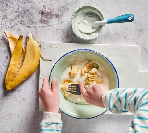 Verser le yogourt dans un récipient. Rincer le pot et le sécher soigneusement: il servira de verre doseur. Couper la banane en morceaux, les ajouter au yogourt, bien les écraser à la fourchette.