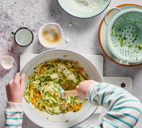 Râper les courgettes à la râpe à rösti, les mélanger avec le sel. Les mettre à égoutter dans une passoire pendant env. 15 min., presser de temps en temps pour en extraire le jus. Hacher menu les abricots, les ajouter au yogourt avec les courgettes, l'œuf, le Birnel et l'huile, bien mélanger.