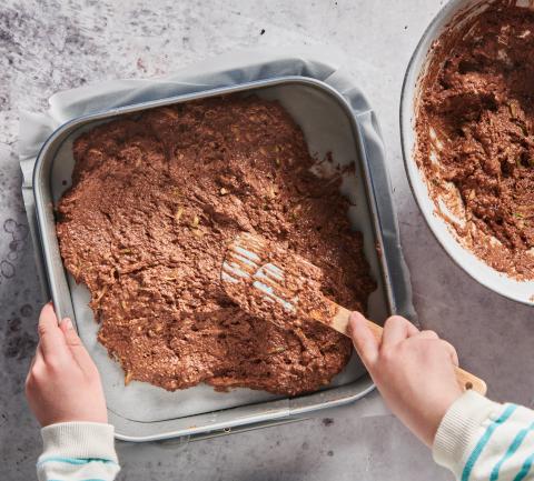 Mélanger la farine, les amandes, le cacao en poudre, la poudre à lever et le bicarbonate de soude. Ajouter le tout à la masse aux courgettes, lisser puis verser la pâte dans le moule.