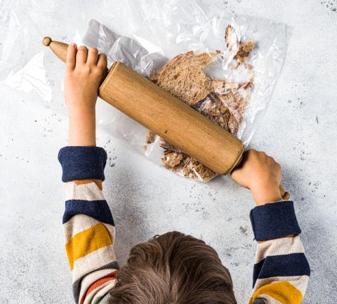 Mettre env. 50 g de pain dans un sac en plastique, l'émietter grossièrement à l'aide d'un rouleau à pâtisserie.