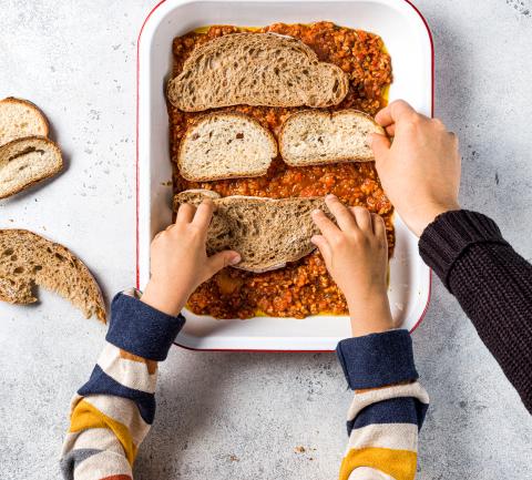 Graisser un plat à gratin (env. 3 litres), disposer en couches alternées la sauce, le pain restant, la sauce béchamel et la mozzarella. Parsemer de miettes de pain et de graines de tournesol.