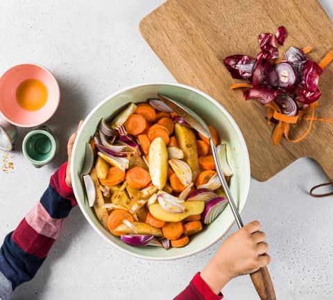 Couper les pommes de terre en quartiers, éplucher les carottes et les couper en rondelles d'env. 1 cm. Peler les oignons, les couper en quartiers. Mélanger les légumes avec l'huile, le curry et le sel, bien mélanger puis répartir le tout sur une plaque recouverte de papier cuisson.