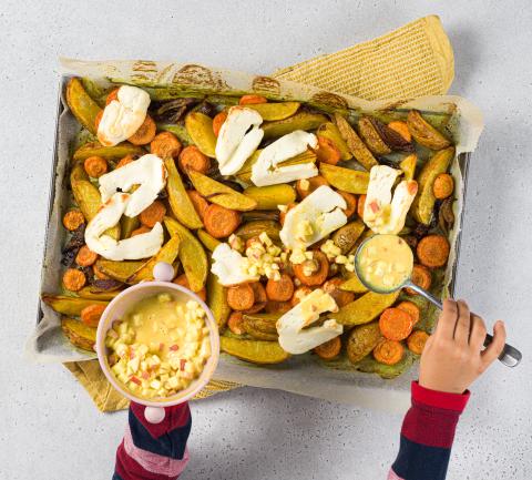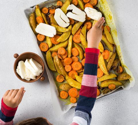 Couper le halloumi en tranches, les mélanger avec l'huile, puis les répartir sur les légumes.