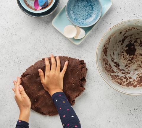 Mélanger le beurre, le sucre glace, l'œuf et le sel à l'aide d'une cuillère en bois. Mélanger la farine, le cacao et les noisettes, les ajouter au mélange précédent et travailler le tout en une pâte. L'aplatir légèrement, la couvrir et la réserver au frais pendant env. 1 h.