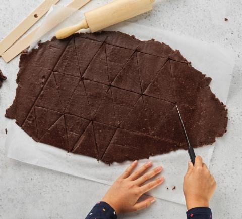 Abaisser la pâte par portions entre deux feuilles de papier cuisson sur une épaisseur de 4 mm. Couper env. 45 triangles de taille égale, les poser sur deux plaques recouvertes de papier cuisson et les mettre au frais pendant env. 15 min.