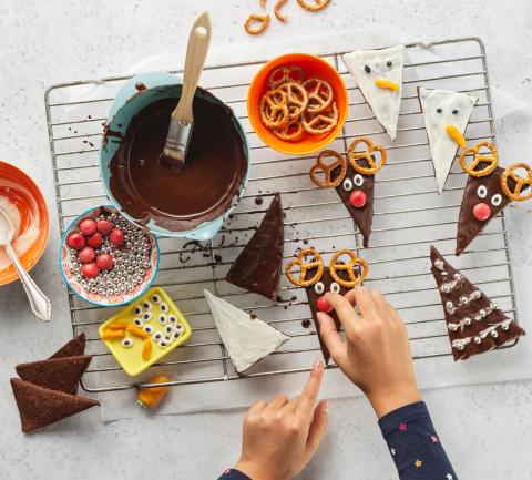 Faire fondre les glaçages dans leur sachet au bain-marie. À l'aide d'un pinceau, badigeonner les ⅔ des biscuits de glaçage foncé et les biscuits restants de glaçage blanc. Pour faire les rennes, décorer la moitié des biscuits recouverts de glaçage foncé avec des bretzels salés, des yeux en sucre et des Smarties. Décorer l'autre moitié de perles en sucre et du reste de glaçage blanc pour faire les sapins. Façonner 15 fins rouleaux avec les carottes en massepain, les poser en guise de nez sur les biscuits recouverts de glaçage blanc, puis dessiner des yeux à l'aide du crayon pâtissier.