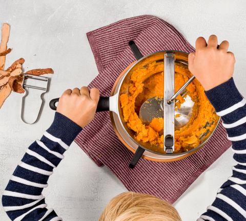 Éplucher les patates et les couper en morceaux. Les faire cuire dans l'eau salée à feu moyen sans couvrir pendant env. 20 min. jusqu'à ce qu'elles soient tendres. Les égoutter et les laisser dans la passoire pendant env. 5 min, jusqu'à ce que l'humidité se soit évaporée. Passer les patates douces au passe-vite dans un saladier, laisser refroidir.