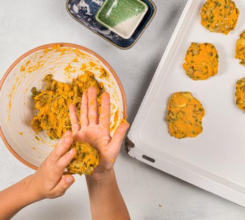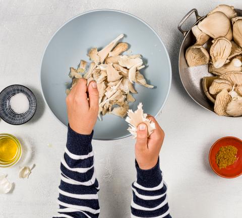 Écraser l'ail dans un récipient. Déchirer les champignons en morceaux, ajouter l'huile, assaisonner et mélanger. Faire revenir les champignons en plusieurs fois dans une poêle antiadhésive pendant env. 5 min., les sortir. Puis les ajouter avec la fécule de pomme de terre et les graines de tournesol à la purée de patates douces, bien mélanger. Ciseler la ciboulette, l'ajouter, mélanger.