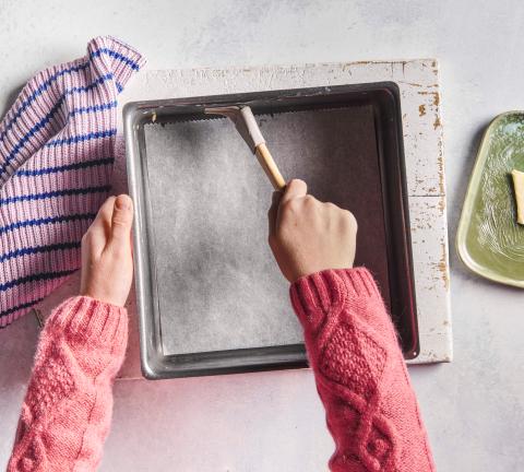 Recouvrir le fond d'un moule à charnière (d'env. 20 cm de Ø) de papier cuisson, graisser les bords et refermer le moule.