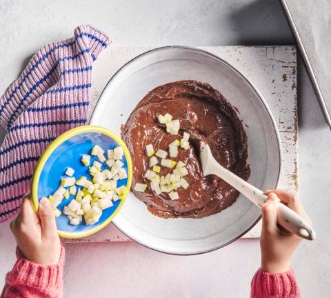Hacher fin le chocolat. Faire fondre le beurre dans une casserole à feu moyen. Retirer la casserole du feu. Ajouter le chocolat, le laisser fondre, le lisser, ajouter le sucre, les œufs et le sel, mélanger le tout au fouet. Hacher grossièrement les noix, en mélanger la moitié avec la farine et la poudre à lever, incorporer le tout à la masse. Couper la poire en dés, les ajouter à la masse et verser la pâte dans le moule.