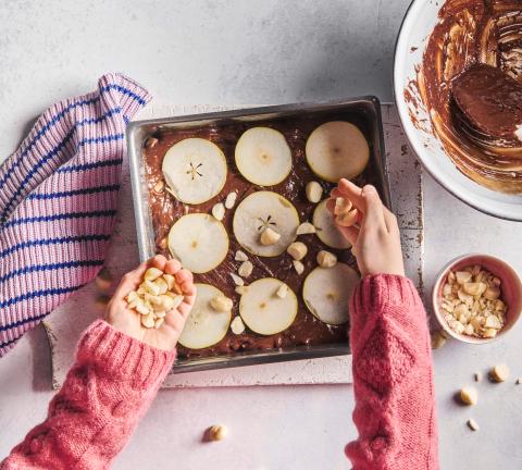 Couper la poire en fines tranches, les répartir sur la pâte avec le reste de noix en appuyant légèrement.