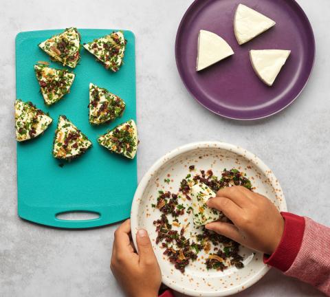Effeuiller le persil, le ciseler et le mettre dans une assiette creuse. Couper fin les canneberges, les ajouter au persil avec les oignons grillés, mélanger. Déballer le fromage, le passer dans la panure en appuyant bien.
