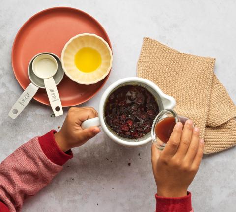 Mettre le vinaigre, l'huile, l'eau et les canneberges dans un bol, mixer et assaisonner.