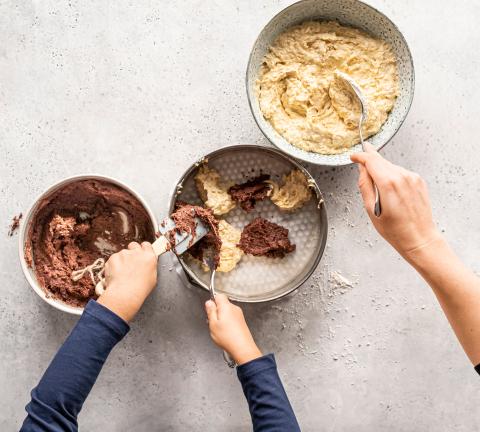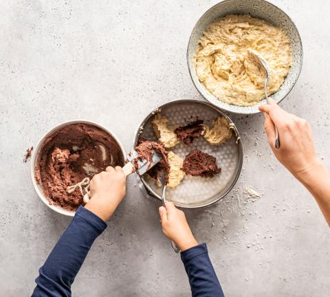 Con un cucchiaio trasferire l’impasto chiaro e quello scuro nello stampo imburrato.