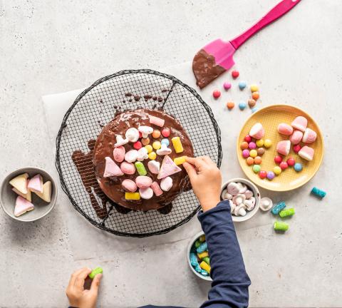 Sciogliere la glassa per torte a bagnomaria o nel forno a microonde, versarla sulla torta, decorare con gli smarties e le caramelle.